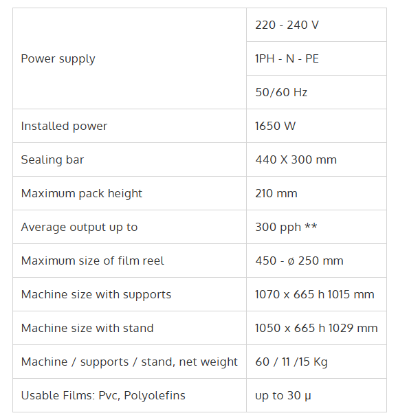 (**) Packs per hour. The stated speed can change according to the product size, the pack collation and the type of film used.