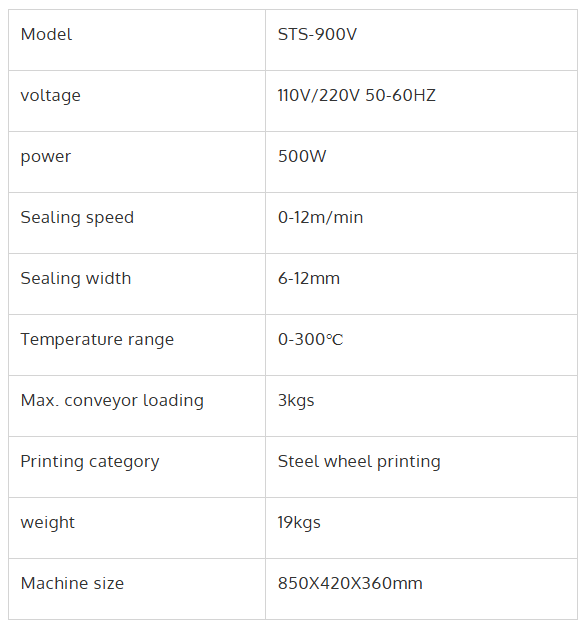 STS -900V STS series continuous film sealing machines finish continuous carrying, sealing and printing in one operation. The machine can be made horizontally, vertically or with stand feet. It adopts electronic constant temperature mechanism and stepless speed regulating transmission motor. It can seal plastic film in various kinds of materials.